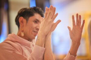The piece uses breath, dance, prayer, and improvisation to tap into blood memory. Not the colour red — the feeling of something old waking up inside the body. Two-Spirit energy guides the shifts: past to future, soft to sharp, masculine to feminine.
